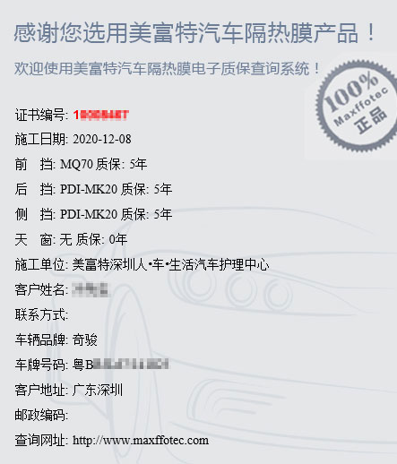 美富特擁有完善的汽車膜質保體系,產品一經授權經銷商和4S店安裝就能獲得不同年限質保,保證質保期內產品無破損、